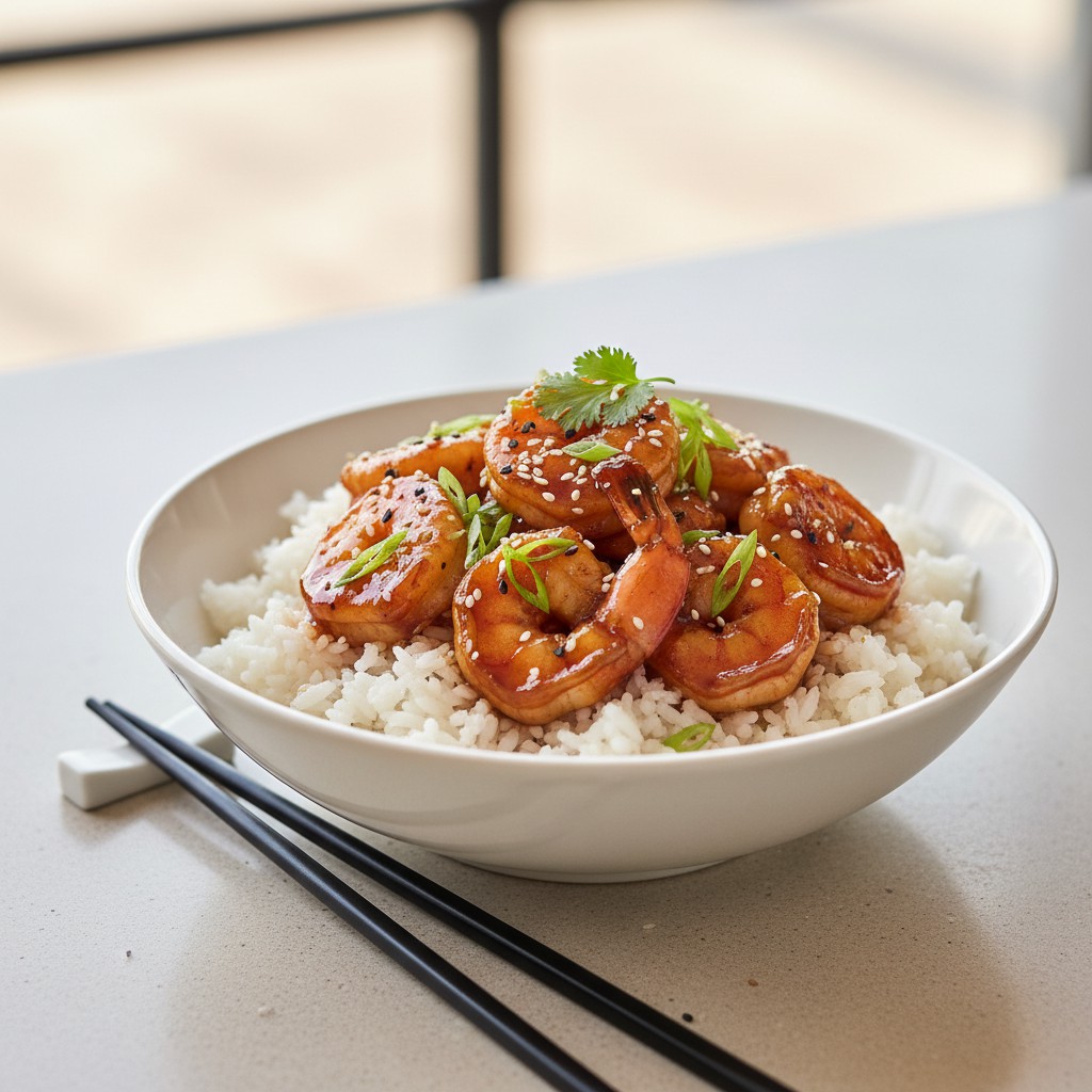 - Servez le riz chaud dans des bols. Disposez les crevettes laquées par-dessus. Parsemez de graines de sésame et de coriandre ou ciboulette ciselée si désiré. Dégustez immédiatement.
