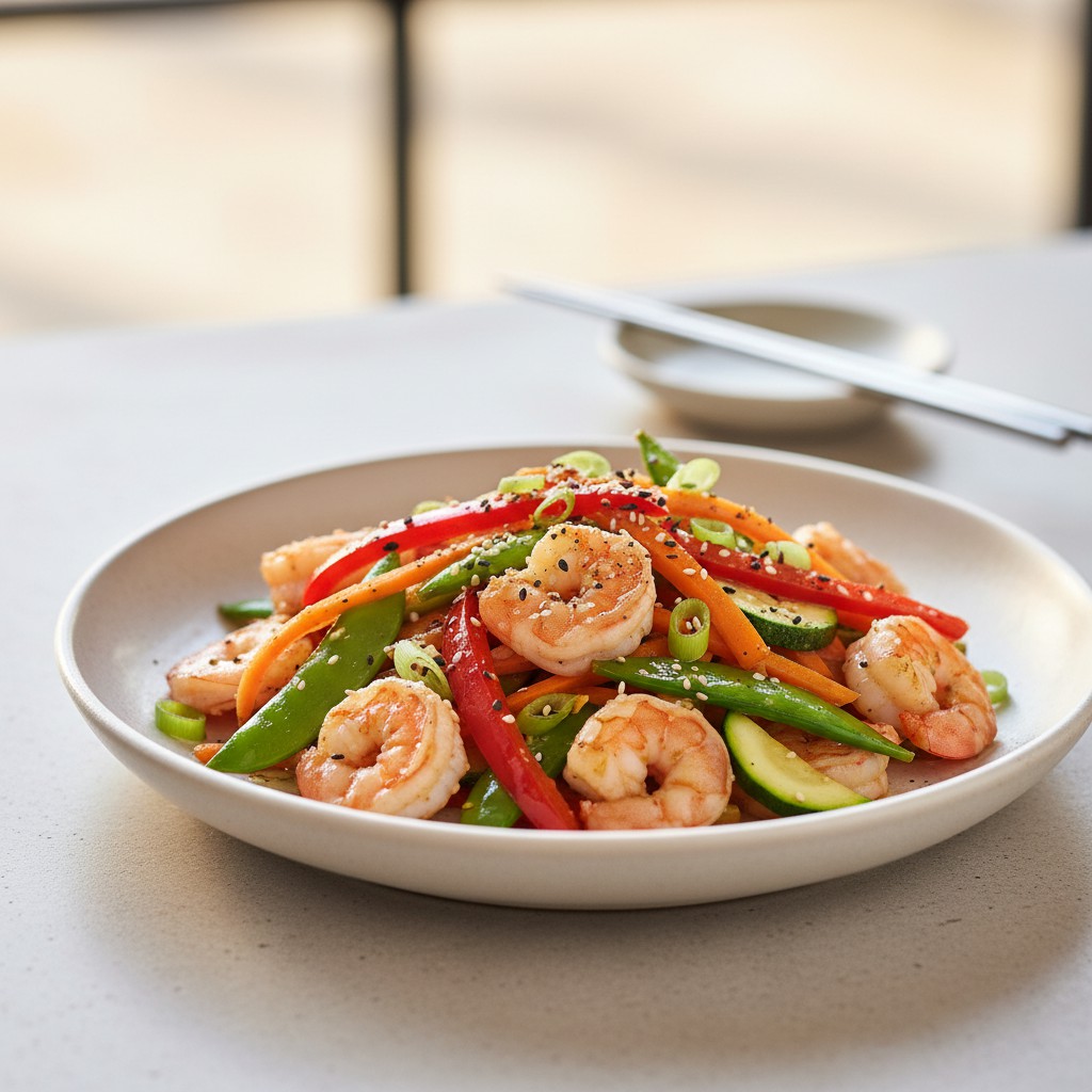 Un plat d’inspiration japonaise qui marie la douceur iodée des crevettes à la profondeur umami du miso, relevé par la fraîcheur et le croquant de légumes de saison. Cette recette, rapide et équilibrée, met en valeur la cuisson précise des crevettes et la juste cuisson des légumes pour préserver leurs qualités nutritionnelles et gustatives. Le miso, ingrédient traditionnel japonais, apporte une note fermentée et salée, tout en étant source de probiotiques. Idéal pour un repas léger, savoureux et riche en textures.