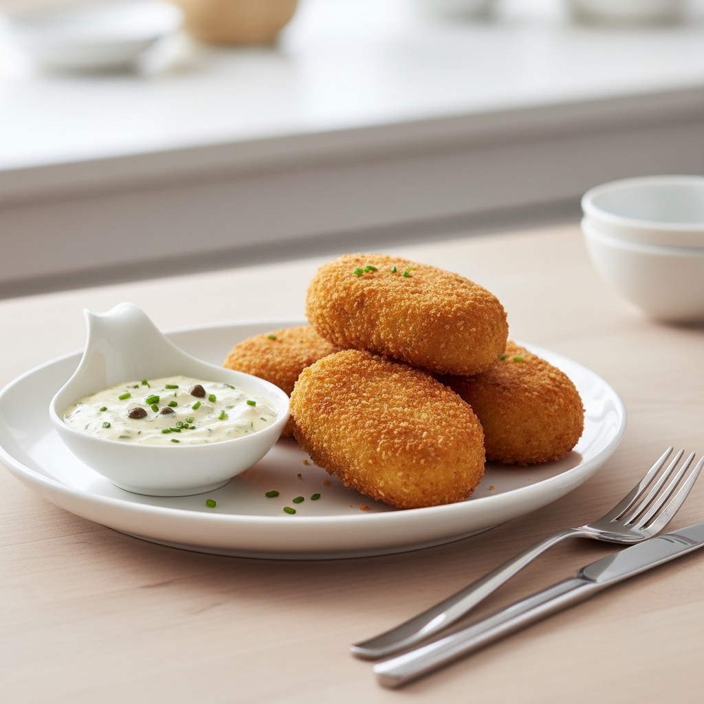 - Servez les croquettes chaudes, accompagnées de la sauce tartare. Proposez une salade verte ou des légumes croquants pour un repas équilibré.