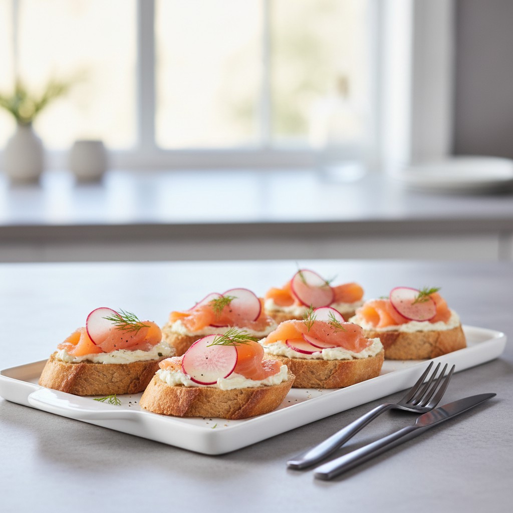 Ces crostinis au saumon fumé et radis sont parfaits pour un apéritif ou une entrée légère. Le mariage du saumon fumé, des radis croquants et d’une base croustillante offre une combinaison de textures et de saveurs irrésistibles. Une recette simple et rapide à préparer, idéale pour impressionner vos invités.
