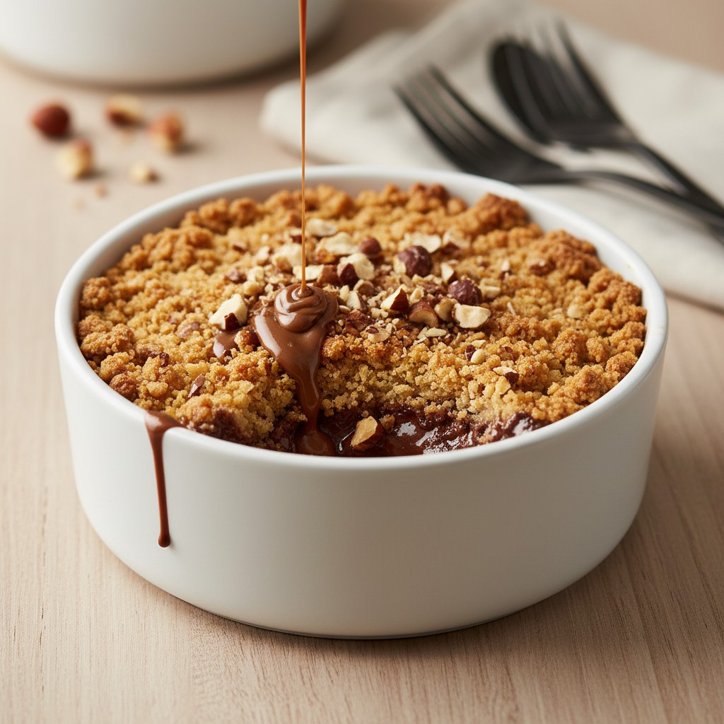 - Préchauffez le four à 180°C (chaleur tournante). Répartissez la garniture chocolat-noisette dans le fond d’un plat à gratin ou de ramequins individuels. Recouvrez uniformément avec le crumble bien froid, sans tasser pour préserver le croustillant.