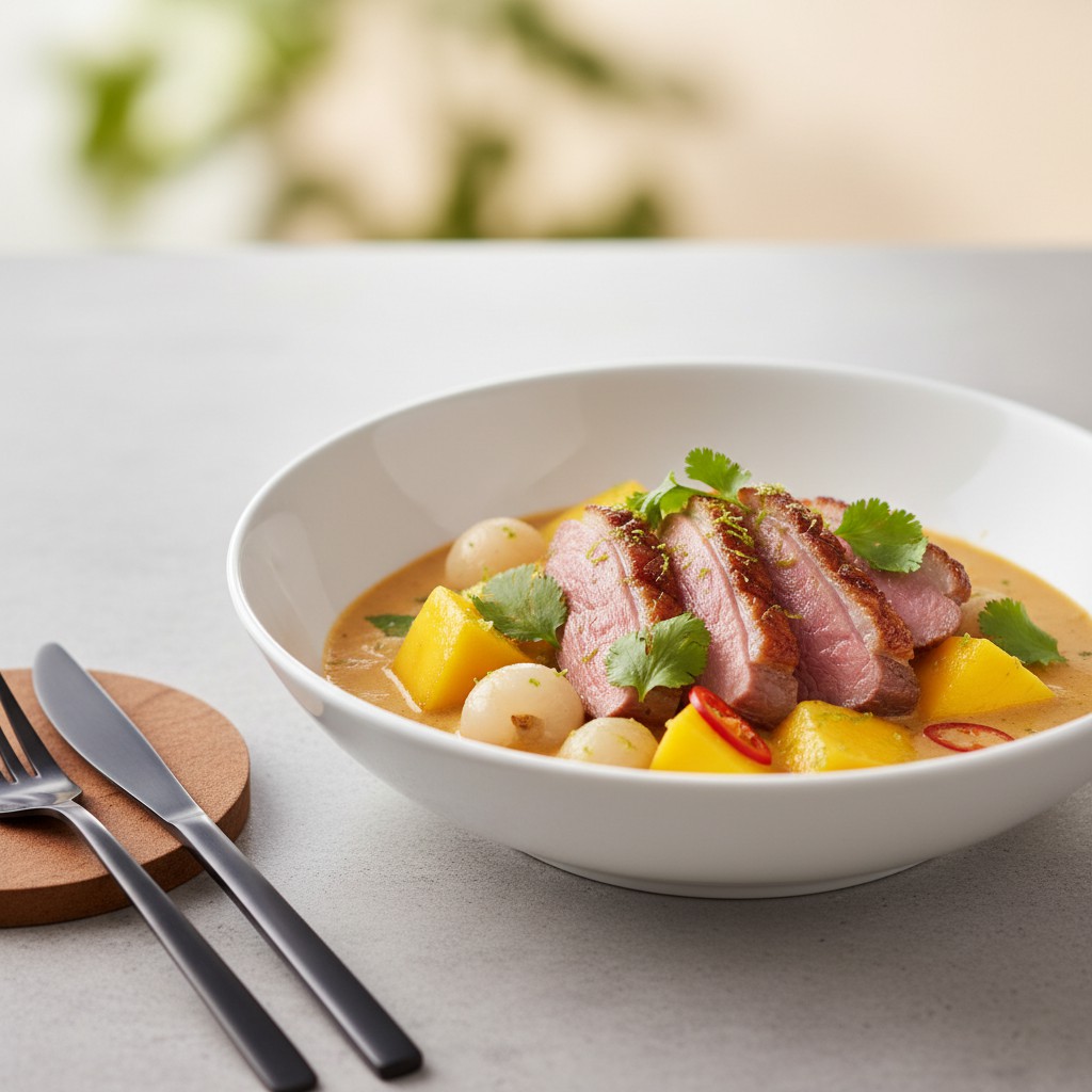Le curry de canard aux fruits est une recette raffinée et chaleureuse, inspirée des traditions culinaires d’Asie du Sud-Est, notamment de la Thaïlande où l’association du canard, des épices et des fruits exotiques est un classique. Ce plat marie la richesse de la viande de canard, la douceur acidulée des fruits (mangue, ananas ou litchi) et la profondeur aromatique d’un curry maison. Il offre un équilibre subtil entre saveurs sucrées, salées et épicées, tout en restant accessible à réaliser chez soi. Idéal pour un repas convivial, il met en valeur la technique de cuisson du canard et l’art de l’assaisonnement, tout en permettant des ajustements nutritionnels selon les besoins.