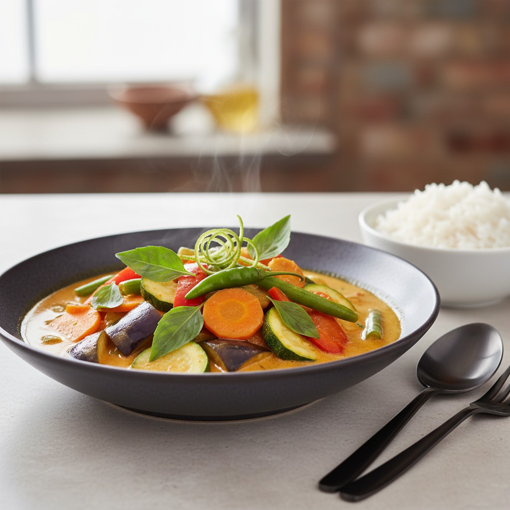 Ce curry de légumes au basilic thaï est un plat végétarien emblématique de la cuisine thaïlandaise, alliant la fraîcheur aromatique du basilic thaï à la richesse d’un curry onctueux. Il met en valeur la diversité des légumes de saison, relevés par une pâte de curry parfumée et du lait de coco. Ce plat, traditionnellement partagé en famille, est apprécié pour sa simplicité, sa rapidité d’exécution et son équilibre nutritionnel. Il offre une expérience gustative authentique, où chaque ingrédient a sa place, et permet de découvrir l’importance de l’harmonie des saveurs dans la cuisine thaïe.