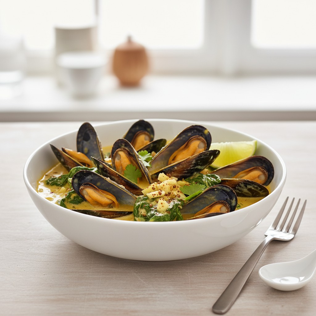 Ce curry de moules et épinards marie la fraîcheur iodée des moules à la douceur végétale des épinards, relevé par un mélange d’épices inspiré de la cuisine indienne. Plat convivial et équilibré, il met en valeur la richesse nutritionnelle des fruits de mer et des légumes-feuilles, tout en restant accessible et rapide à préparer. Traditionnellement, les currys de moules sont populaires sur les côtes atlantiques et en Bretagne, où l’on adapte les épices au goût local. Ici, l’association avec les épinards apporte une touche de modernité et de couleur, tout en renforçant l’apport en fibres et en minéraux.