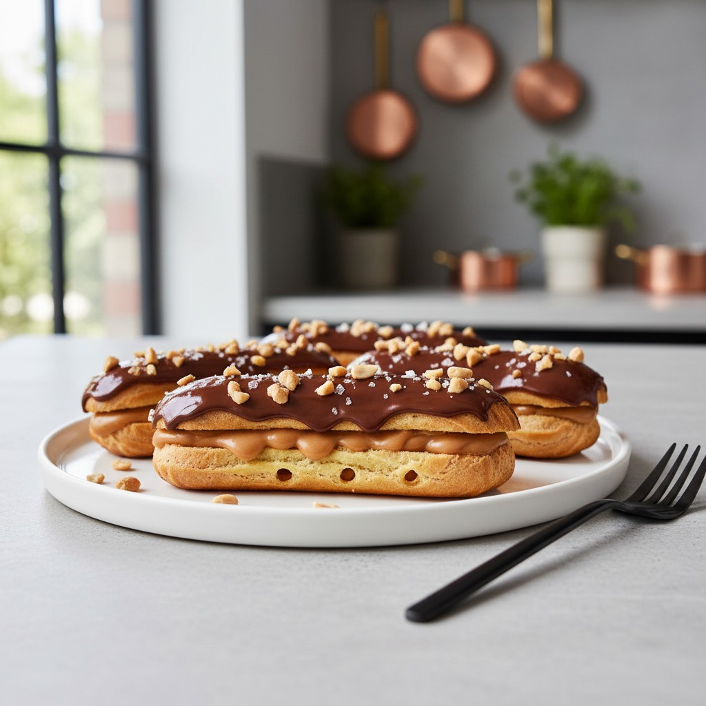 Ces éclairs au chocolat façon Snickers revisitent un grand classique de la pâtisserie française en y intégrant la gourmandise du célèbre chocolat américain : cacahuètes grillées, caramel fondant et ganache chocolat au lait. L’équilibre entre la pâte à choux légère, la douceur du caramel, le croquant des cacahuètes et la puissance du chocolat offre une expérience sensorielle complète. Cette recette, accessible mais technique, permet de comprendre les fondamentaux de la pâte à choux et du montage pâtissier, tout en s’initiant à l’art de l’association des textures. Les éclairs sont emblématiques de la tradition boulangère française, ici modernisés par une inspiration américaine, pour un dessert à la fois authentique et innovant.