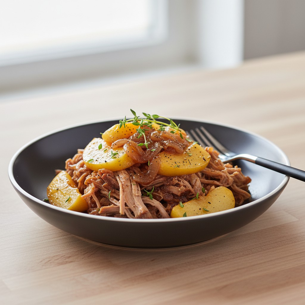 Effiloché de porc aux oignons caramélisés et pommes fondantes