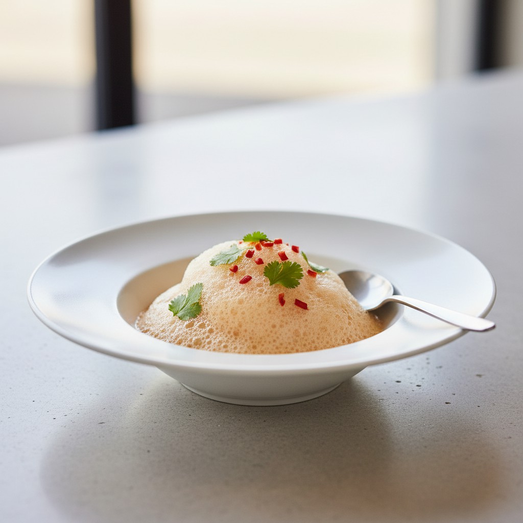 - Maintenez le siphon au bain-marie à une température ne dépassant pas 50°C pour conserver la texture mousseuse. Servez l’émulsion chaude ou tiède en accompagnement de vos plats.