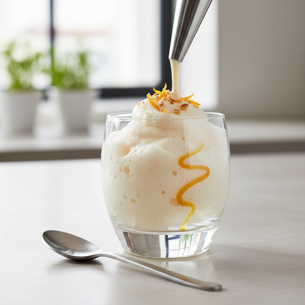 - Secouez le siphon avant de servir. Dressez l’émulsion dans des verrines ou directement sur un dessert. Décorez avec des zestes d’orange ou des éclats d’amandes pour une touche finale.