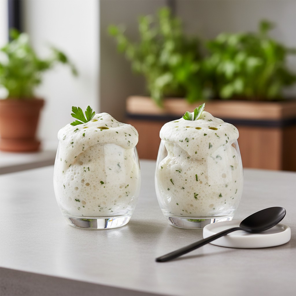 - Au moment de servir, secouez à nouveau le siphon. Tenez-le tête en bas et pressez doucement pour libérer l’émulsion. Servez dans des verrines, sur un plat principal ou en accompagnement. Décorez avec quelques feuilles de persil frais.