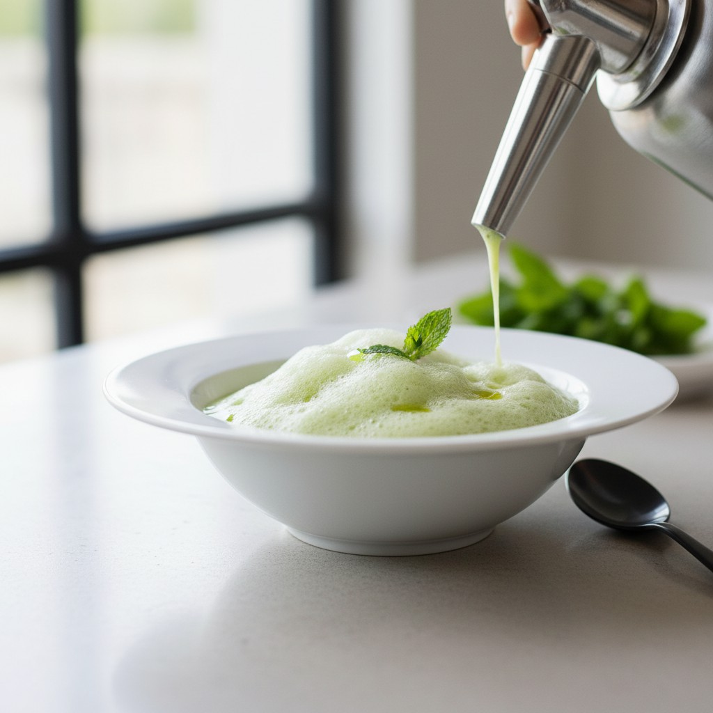 - Secouez le siphon avant de servir. Tenez-le tête en bas et pressez doucement pour libérer l’émulsion dans des verrines ou des assiettes. Décorez avec une feuille de menthe fraîche et servez immédiatement.