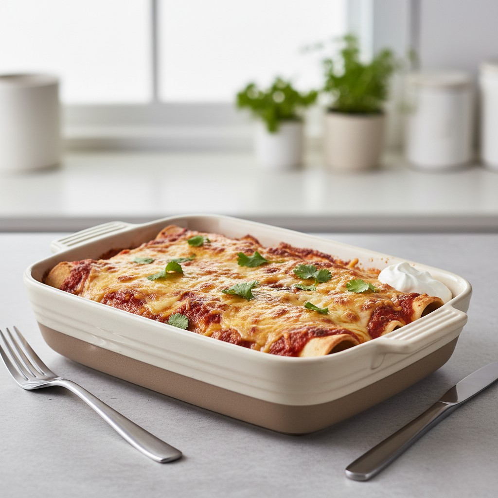- Sortez les enchiladas du four et laissez-les reposer 5 minutes. Garnissez de coriandre fraîche et servez avec de la crème fraîche ou du yaourt nature, si désiré.