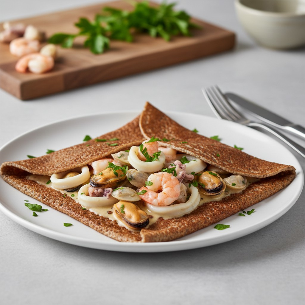 La galette de sarrasin aux fruits de mer est une spécialité bretonne qui marie la rusticité de la pâte de blé noir à la finesse iodée des fruits de mer. Cette recette, emblématique de la tradition bretonne, offre un équilibre entre textures croustillantes et garniture moelleuse, tout en restant naturellement sans gluten. Elle met en valeur la simplicité des produits locaux et la technique du pliage, pour une expérience authentique et savoureuse. Idéale pour un repas complet, elle se distingue par sa richesse en protéines, sa faible teneur en matières grasses et sa capacité à sublimer des ingrédients frais sans artifice.