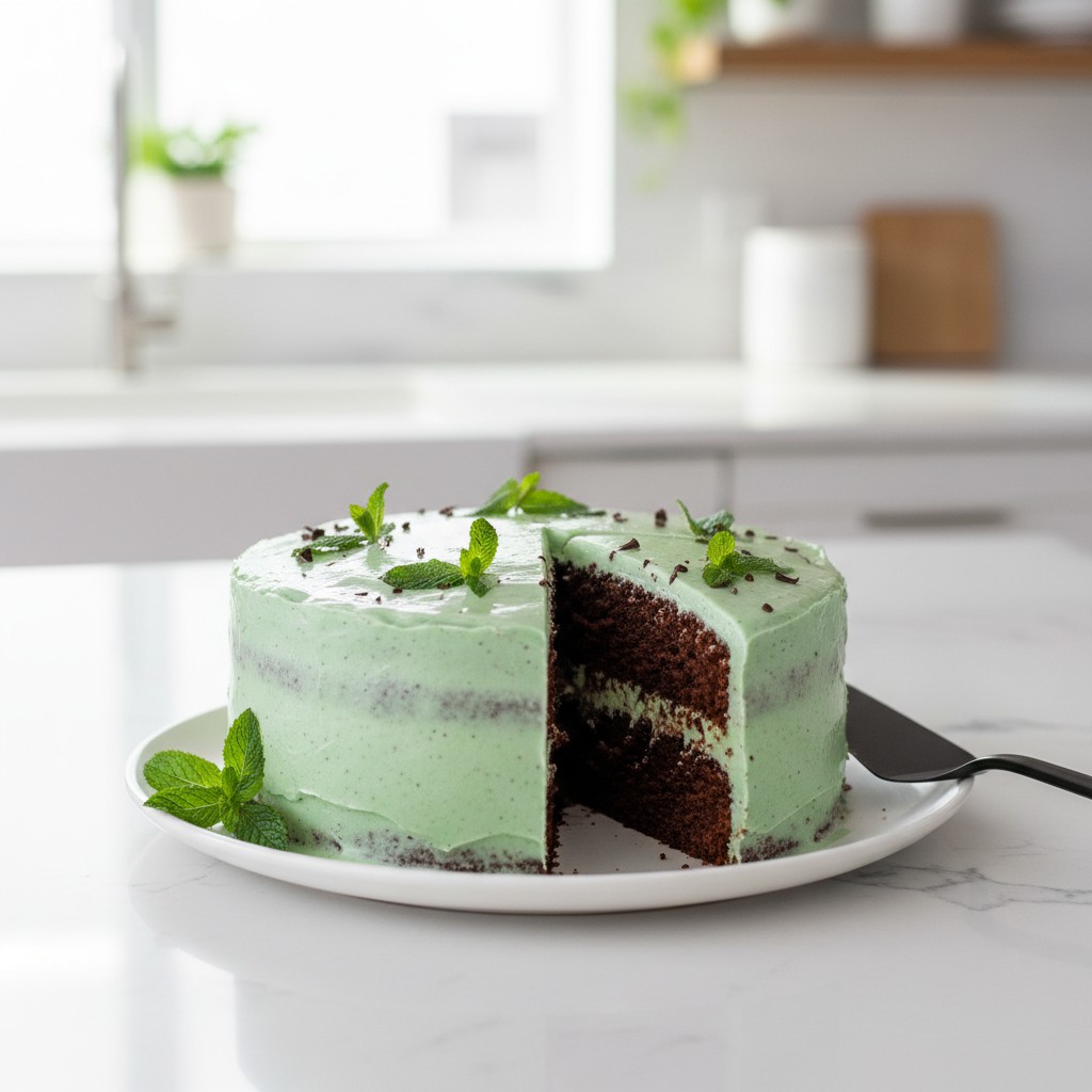 - Étalez le fudge à la menthe sur le gâteau refroidi à l’aide d’une spatule. Décorez avec des feuilles de menthe fraîche si désiré. Laissez reposer au réfrigérateur pendant 1 heure avant de servir pour que le glaçage prenne bien.