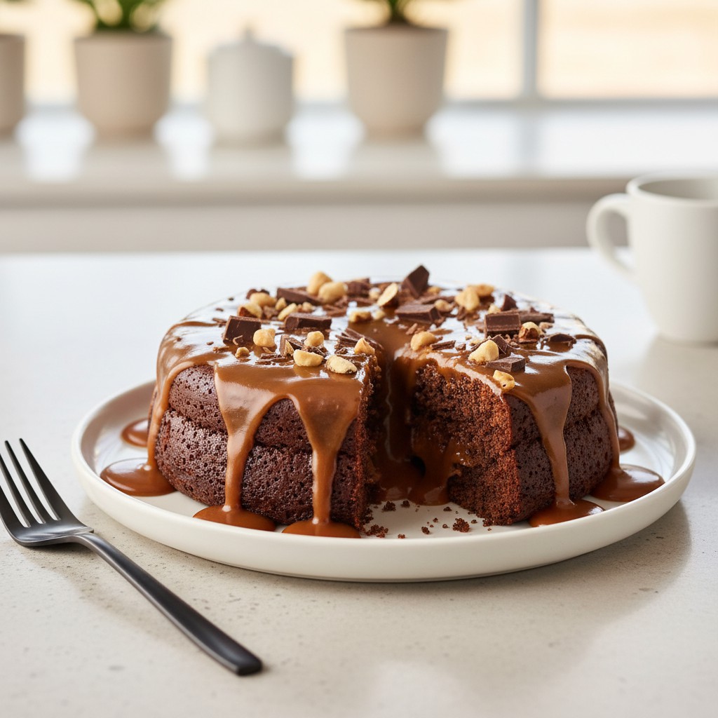 - Laissez le gâteau tiédir avant de le démouler. Nappez-le de la sauce au fudge et servez. Vous pouvez ajouter des éclats de chocolat ou des noisettes pour plus de gourmandise.