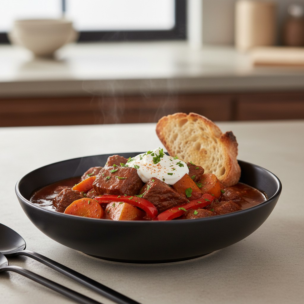 - En fin de cuisson, la viande doit être très tendre et la sauce nappante. Rectifiez l’assaisonnement. Retirez le laurier. Servez bien chaud, idéalement avec du pain de campagne ou des pâtes fraîches (type csipetke ou spaetzle).