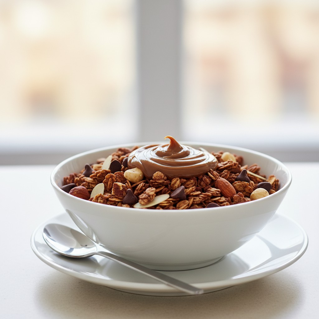 - Servez le granola dans des bols et ajoutez une cuillère de crème de marron par-dessus. Vous pouvez également l’accompagner de yaourt ou de lait selon vos préférences.