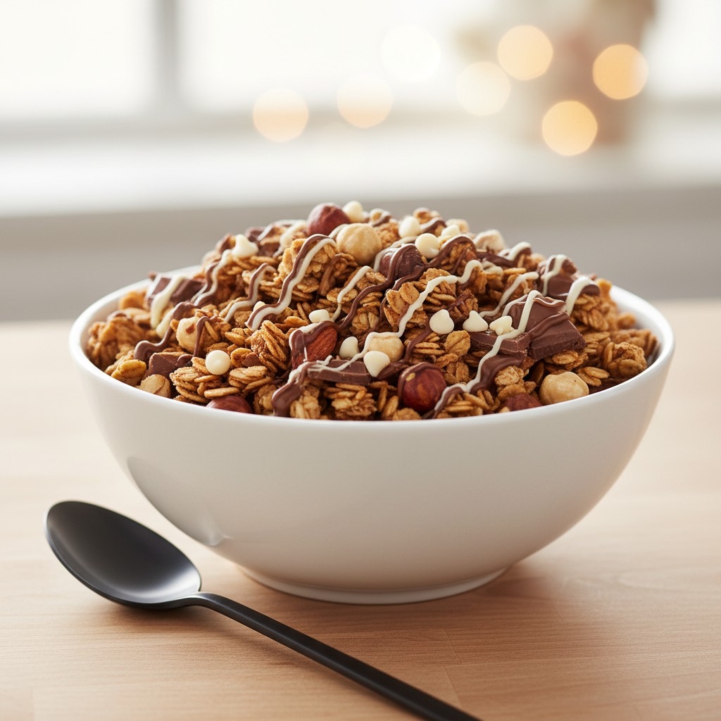 Ce granola maison s’inspire des saveurs iconiques du Kinder Bueno : alliance de noisette, chocolat au lait et pointe de vanille, le tout dans un mélange croustillant et équilibré. Parfait pour un petit-déjeuner ou un snack gourmand, il marie plaisir et nutrition, tout en évitant les excès de sucre et de matières grasses des versions industrielles. Le granola, originaire des États-Unis, est ici revisité avec une touche italienne pour rappeler la fameuse confiserie. Cette recette met l’accent sur la maîtrise de la torréfaction et l’équilibre des textures, pour un résultat à la fois sain, savoureux et régressif.