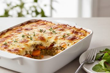 - Enfournez le plat pendant 20 à 25 minutes, jusqu’à ce que le dessus soit bien doré et que le gratin soit pris. Servez chaud.