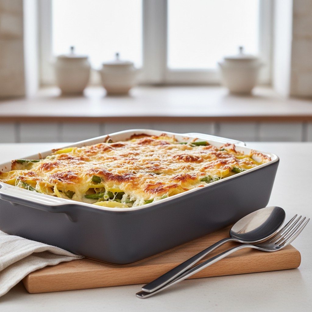Ce gratin de haricots verts et pommes de terre est un plat familial ancré dans la tradition culinaire française, apprécié pour sa simplicité, sa générosité et son équilibre nutritionnel. Il associe la douceur fondante de la pomme de terre à la fraîcheur des haricots verts, le tout relevé par une fine couche gratinée. Idéal pour accompagner une viande ou en plat principal végétarien, il met en valeur des ingrédients accessibles et de saison. Ce plat, souvent préparé dans les campagnes françaises, est un exemple d’économie de moyens et de valorisation des légumes du potager. La recette proposée ici privilégie la justesse des cuissons, l’assaisonnement précis et la maîtrise du gratinage pour un résultat savoureux et digeste.