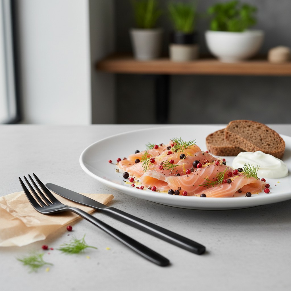 - Disposez les tranches de gravlax sur un plat de service. Accompagnez-les de pain noir, de crème fraîche ou d’une sauce moutarde à l’aneth pour une dégustation authentique.