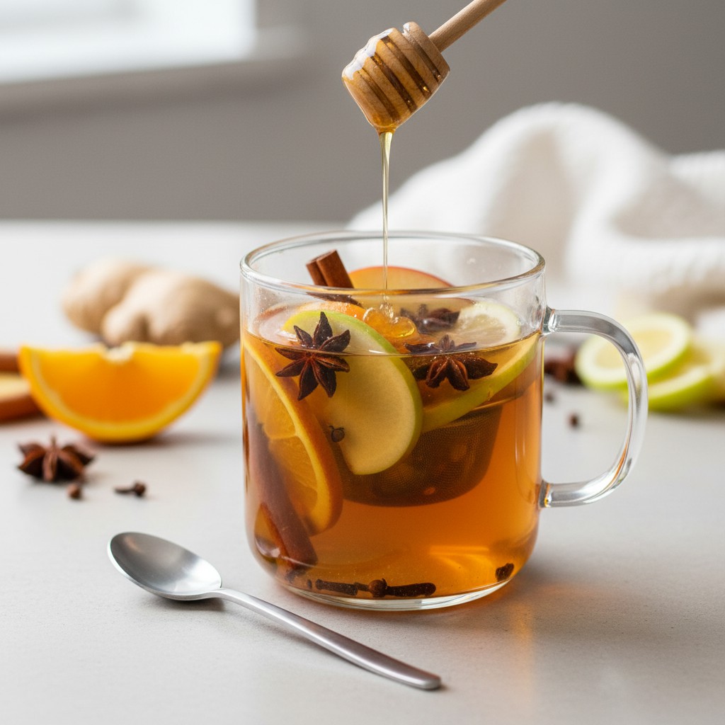 - Filtrez l’infusion à l’aide d’une passoire fine pour retirer les morceaux de fruits et d’épices. Versez dans des tasses. Si vous le souhaitez, ajoutez une cuillère de miel ou de sirop d’érable pour sucrer légèrement.