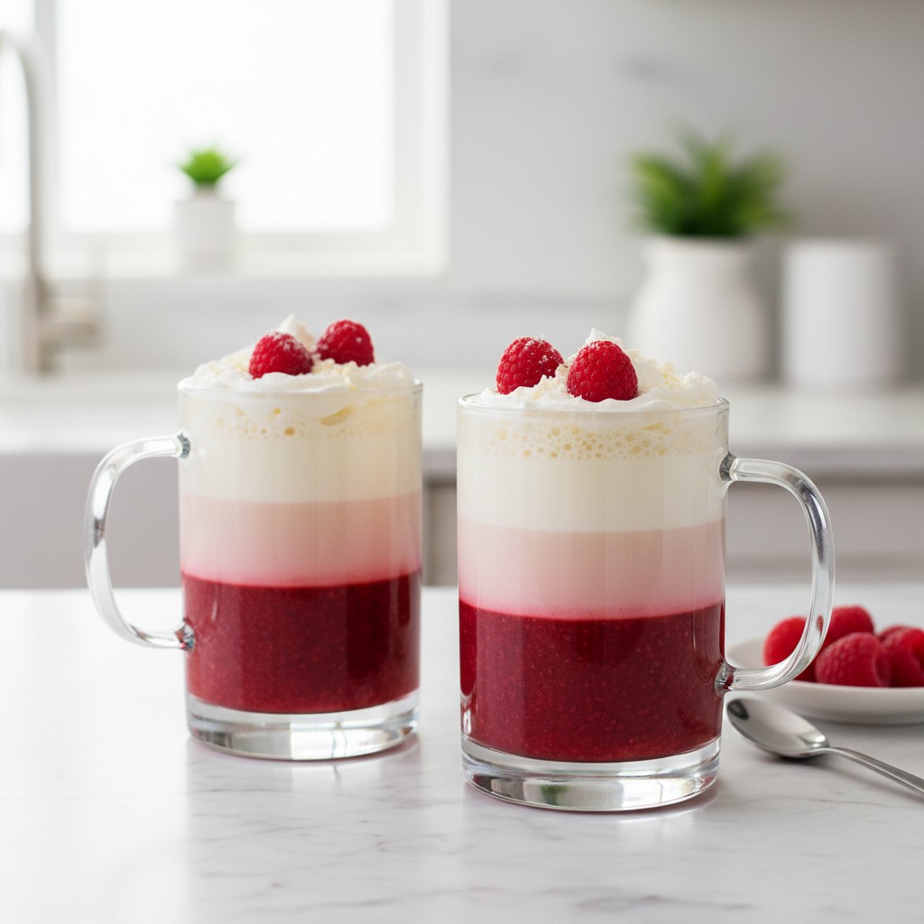 - Répartissez la purée de framboises dans le fond de deux tasses. Versez délicatement le mélange de lait chaud et de chocolat blanc par-dessus, en veillant à ne pas mélanger pour conserver les couches.