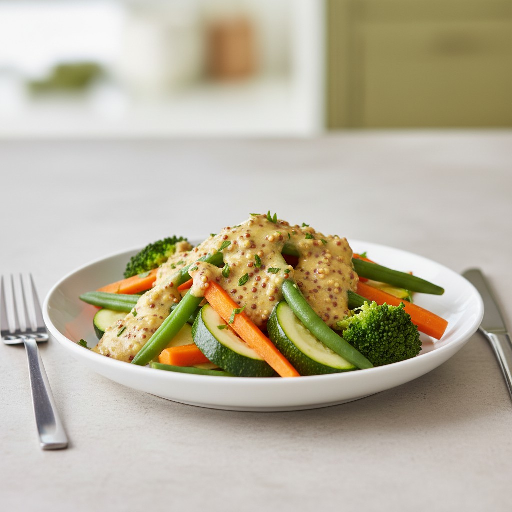 - Disposez les légumes chauds dans un plat ou directement dans les assiettes. Nappez-les de sauce à la moutarde juste avant de servir, ou servez la sauce à part pour que chacun dose selon ses envies. Parsemez éventuellement d’herbes fraîches (persil, ciboulette) pour une touche de fraîcheur.