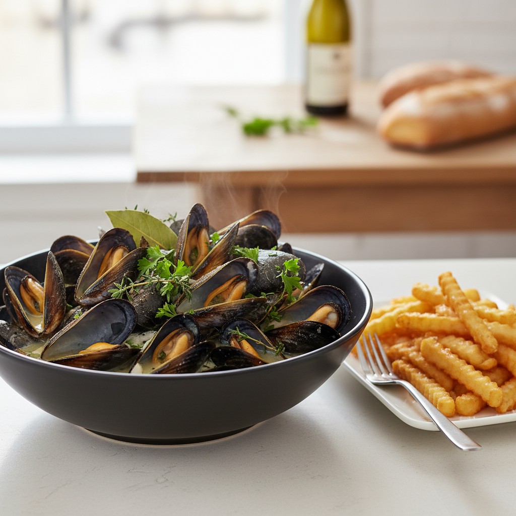 - Servez les moules bien chaudes dans leur jus, accompagnées des frites croustillantes. Proposez le bouillon à part pour tremper les frites ou du pain frais pour saucer.