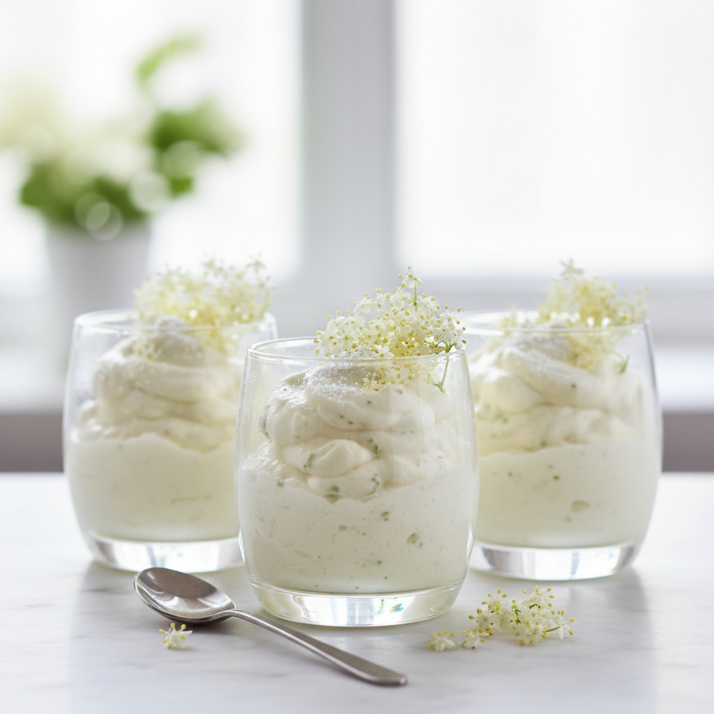 - Avant de servir, décorez chaque verrine avec quelques fleurs de sureau fraîches ou séchées, si désiré. Servez bien frais.