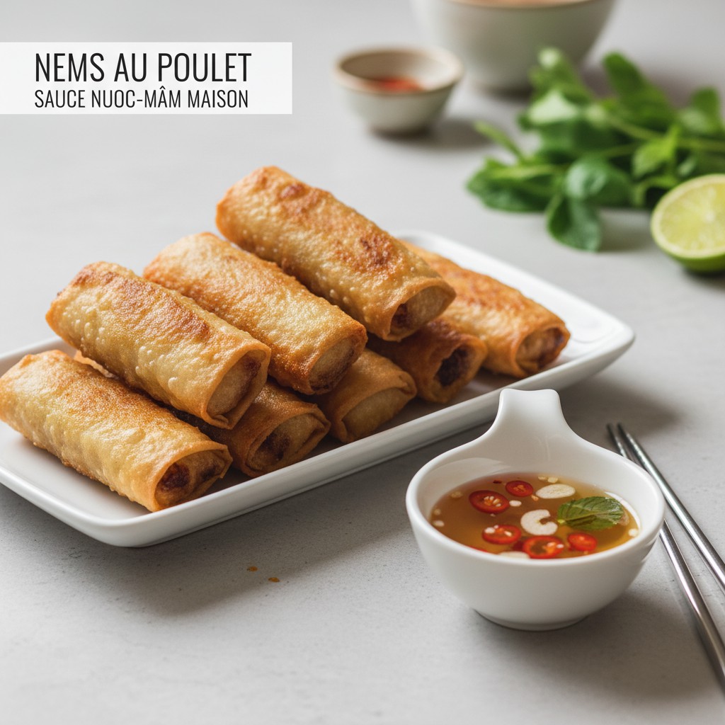 Découvrez comment préparer des nems au poulet croustillants accompagnés d’une sauce nuoc-mâm maison. Une recette vietnamienne authentique, parfaite pour un repas convivial ou une entrée savoureuse. Facile à réaliser, elle allie des saveurs équilibrées et une texture irrésistible.