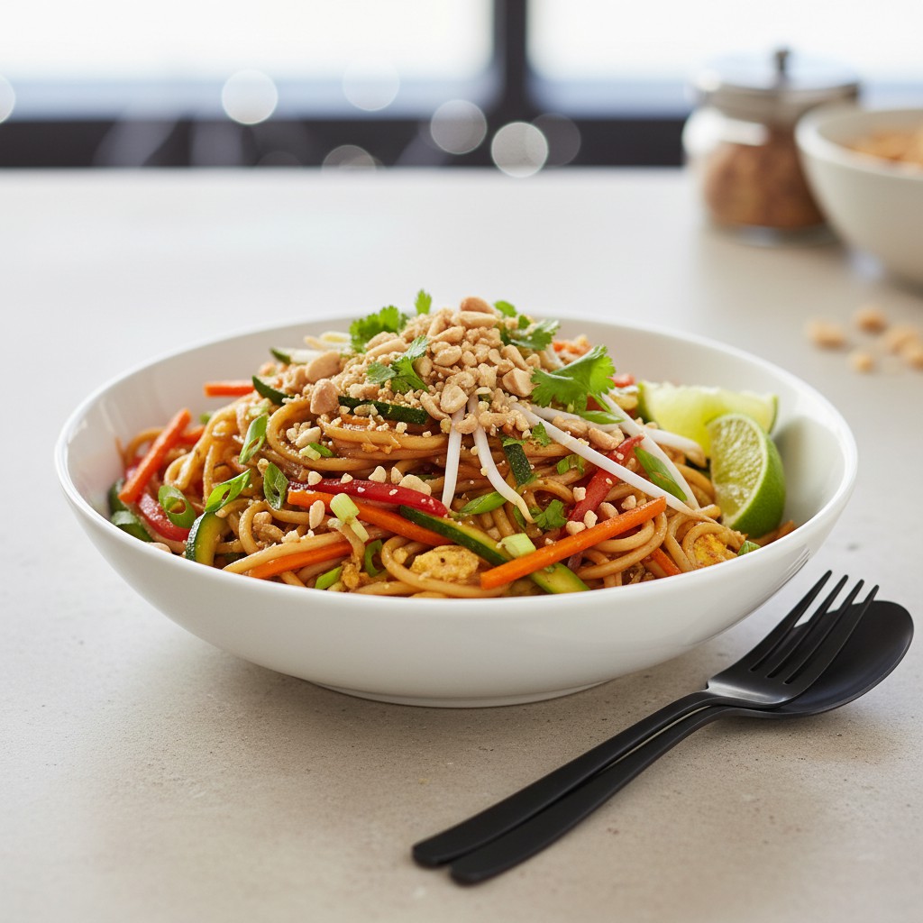 Plat emblématique de la cuisine de rue thaïlandaise, les nouilles thaï aux légumes et arachides offrent un équilibre subtil entre textures croquantes, saveurs acidulées, sucrées et salées. Cette recette végétarienne, inspirée du célèbre Pad Thaï, met en avant la fraîcheur des légumes sautés, la richesse des arachides grillées et la gourmandise d’une sauce maison. Accessible et rapide, elle permet de découvrir l’authenticité de la cuisine thaïe tout en respectant l’équilibre nutritionnel : féculents, protéines végétales, fibres et bons lipides. Idéale pour un repas complet, elle s’adapte facilement aux saisons et aux préférences alimentaires.