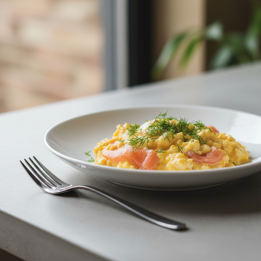 Découvrez comment préparer des œufs brouillés onctueux, agrémentés de saumon fumé et d’aneth frais. Une recette simple et rapide, idéale pour un petit-déjeuner gourmand ou un brunch équilibré. Ce plat associe la douceur des œufs à la saveur subtile du saumon fumé, relevée par une touche d’aneth.