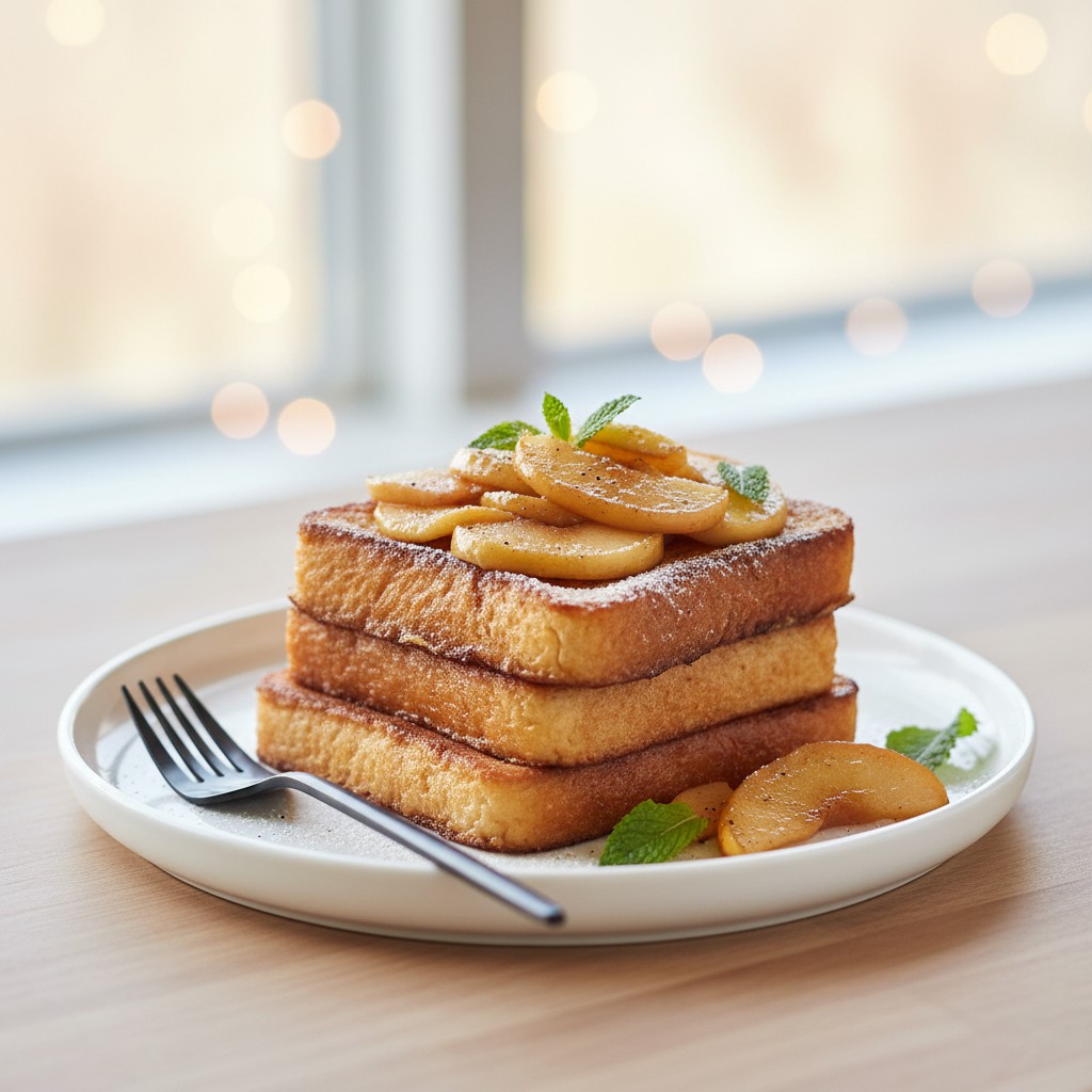 - Disposez les tranches de pain perdu sur les assiettes, garnissez généreusement de pommes poêlées. Servez immédiatement, éventuellement avec un filet de miel, un peu de yaourt nature ou quelques fruits frais pour un équilibre nutritionnel optimal.