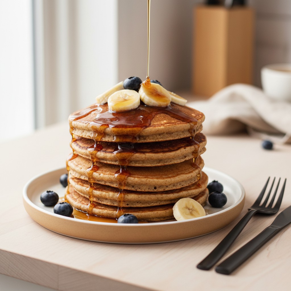 Ces pancakes à la farine complète offrent une texture moelleuse et une saveur légèrement rustique, sublimée par la douceur naturelle du sirop d’érable. Cette version revisite le classique américain en privilégiant l’équilibre nutritionnel : la farine complète apporte fibres et satiété, tout en conservant le plaisir d’un petit-déjeuner gourmand. Les pancakes sont emblématiques de la culture nord-américaine, traditionnellement dégustés lors des brunchs dominicaux. Ici, la recette est pensée pour être accessible, reproductible et adaptée à une alimentation équilibrée, sans sacrifier le goût ni la texture.