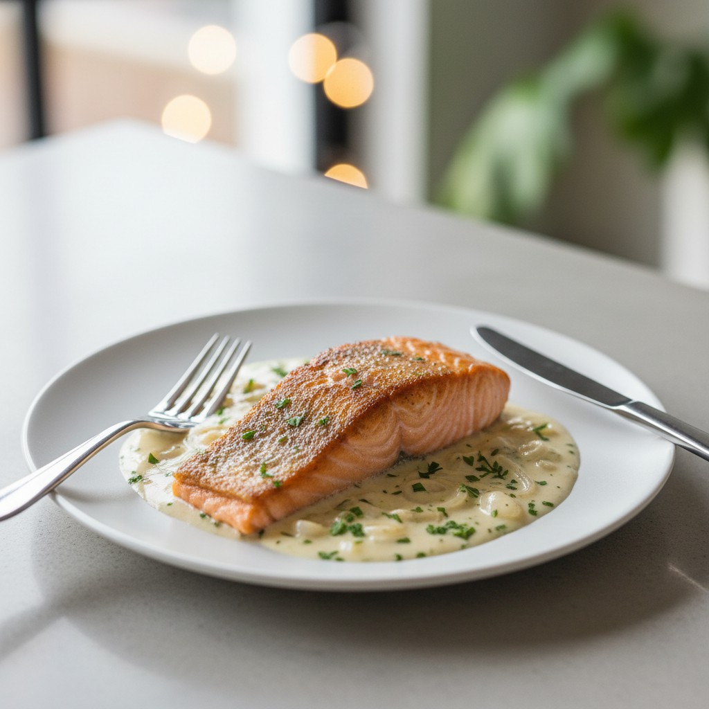 - Une fois le saumon cuit, retirez-le délicatement de la poêle et réservez-le au chaud. Ajoutez la crème fraîche dans la poêle avec la réduction de vin blanc et échalotes. Mélangez bien et laissez mijoter 2 à 3 minutes pour obtenir une sauce onctueuse. Rectifiez l’assaisonnement avec du sel, du poivre et éventuellement un filet de jus de citron.