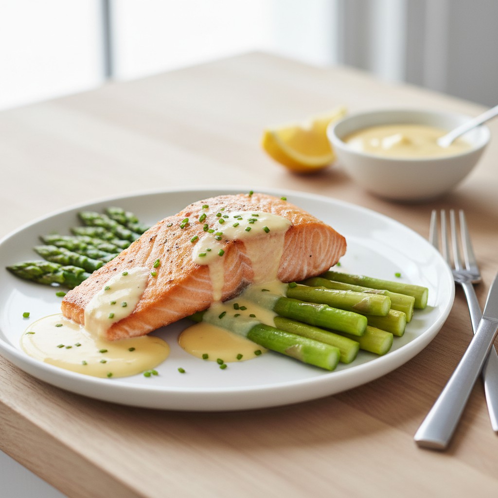 Pavé de saumon avec asperges et sauce hollandaise maison