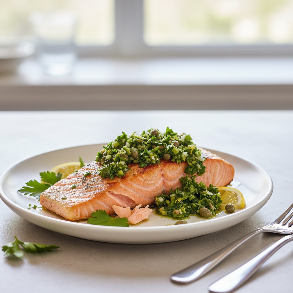 - Disposez les pavés de saumon dans les assiettes et nappez-les généreusement de salsa verde. Servez immédiatement avec un accompagnement de légumes grillés, de riz complet ou de pommes de terre vapeur pour un repas équilibré.