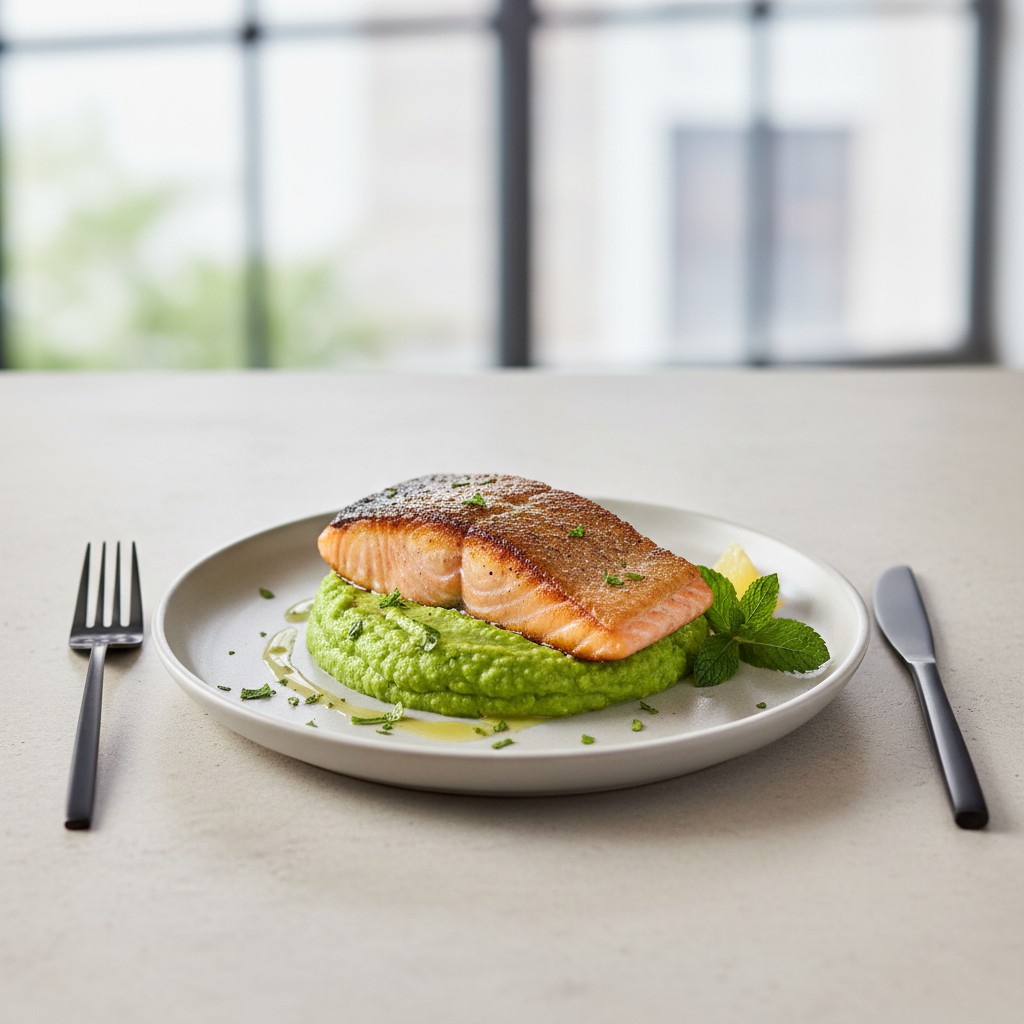 Pavé de saumon poêlé avec purée de petits pois à la menthe