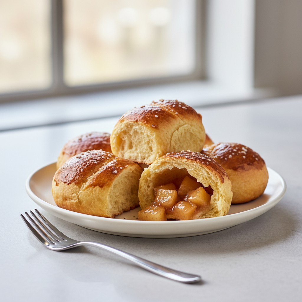 - Dégazez la pâte sur un plan légèrement fariné. Divisez-la en 8 portions égales. Étalez chaque portion en un petit disque, déposez une cuillère de pommes caramélisées au centre, refermez soigneusement en pinçant les bords pour enfermer la garniture. Roulez délicatement pour former une boule bien soudée.