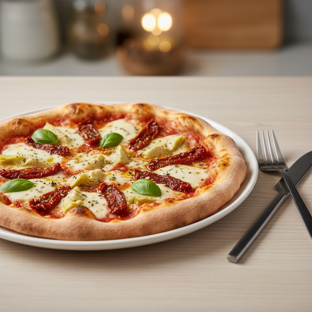 Une pizza maison savoureuse garnie de tomates séchées, d’artichauts marinés et de mozzarella fondante. Cette recette méditerranéenne est idéale pour un repas convivial et équilibré, avec des ingrédients simples et authentiques.