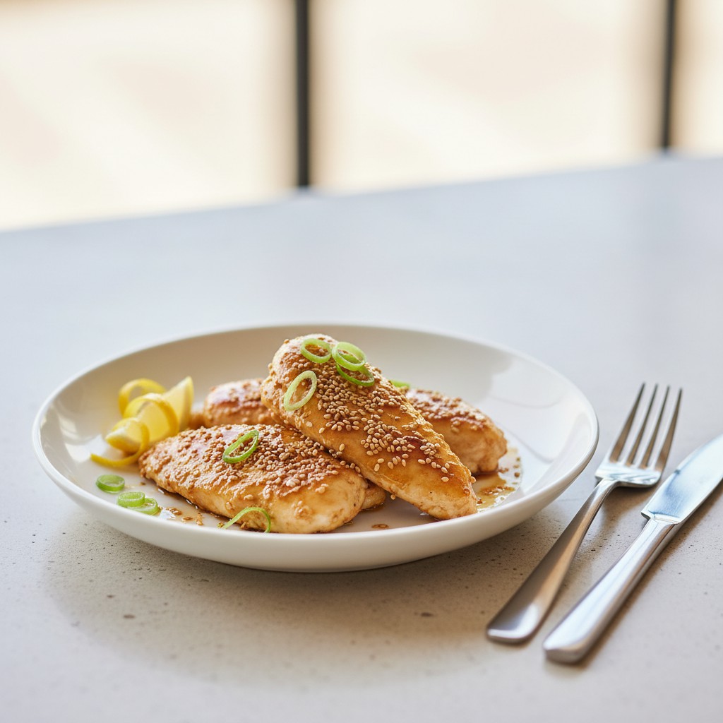 - Disposez les filets de poulet dans une assiette, nappez-les de sauce réduite et saupoudrez de graines de sésame grillées. Ajoutez éventuellement des rondelles d’oignon vert pour la garniture. Servez chaud avec du riz ou des légumes sautés.