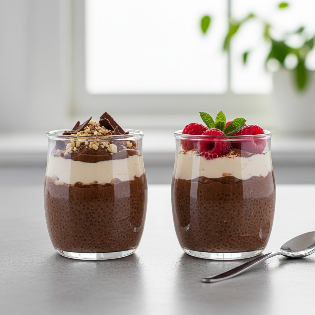 - 5. Répartissez la préparation dans 4 verrines ou petits pots. Couvrez et placez au réfrigérateur au moins 4 heures, idéalement toute une nuit. Les graines de chia vont absorber le liquide et former une texture de pudding.