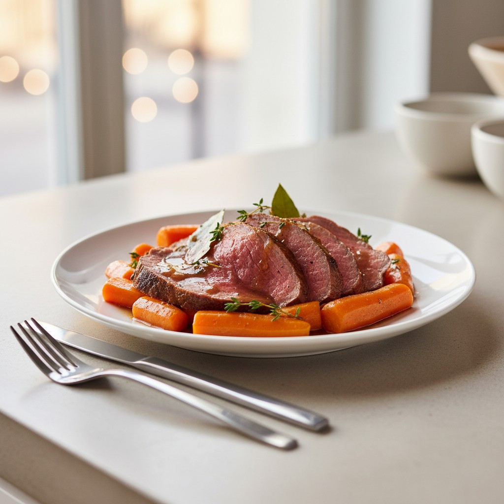 Le rôti de bœuf aux carottes est un classique de la cuisine familiale française, apprécié pour sa simplicité, sa générosité et sa capacité à sublimer des ingrédients du quotidien. Ce plat met en valeur la tendreté du bœuf, lentement rôti pour préserver son jus, et la douceur des carottes, qui s’imprègnent des sucs de viande. Traditionnellement servi lors des repas dominicaux, il incarne la convivialité et l’équilibre nutritionnel : protéines de qualité, légumes fondants, et une sauce naturellement savoureuse sans excès de matières grasses. Cette recette vous guide pas à pas pour réussir une cuisson homogène, obtenir une viande juteuse et des carottes parfaitement confites, tout en vous donnant les clés pour adapter le plat à vos besoins (allégés, sans gluten, etc.).