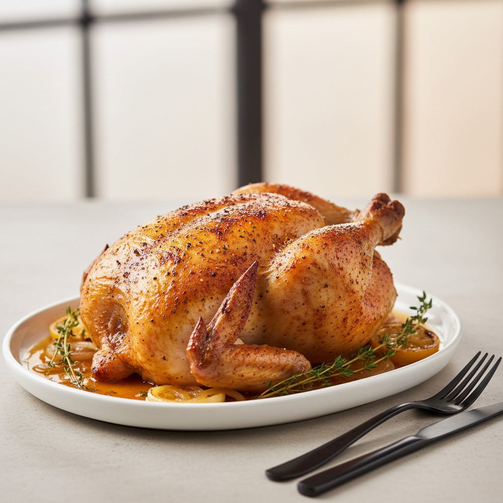 - Découpez le poulet (cuisses, blancs, ailes) et servez avec le jus de cuisson filtré, accompagné de légumes rôtis ou d’une salade croquante.