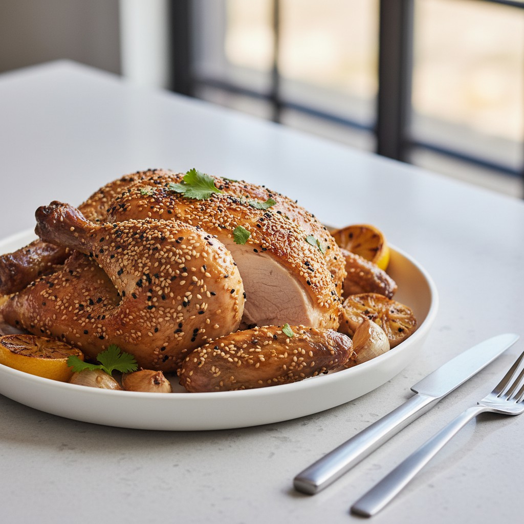 Le rôti de poulet au sésame est une variation savoureuse du traditionnel poulet rôti, enrichie par la profondeur aromatique du sésame grillé. Cette recette, d’inspiration asiatique, marie la tendreté du poulet à la richesse des graines de sésame, tout en restant accessible et équilibrée. Elle met en avant la simplicité d’un plat familial, tout en apportant une touche d’originalité et de croquant. Idéale pour un repas convivial, elle permet de varier du classique sans complexifier la préparation. L’ajout du sésame, ingrédient ancestral utilisé dans de nombreuses cuisines du monde, apporte des acides gras insaturés et des minéraux, tout en sublimant la peau du poulet.