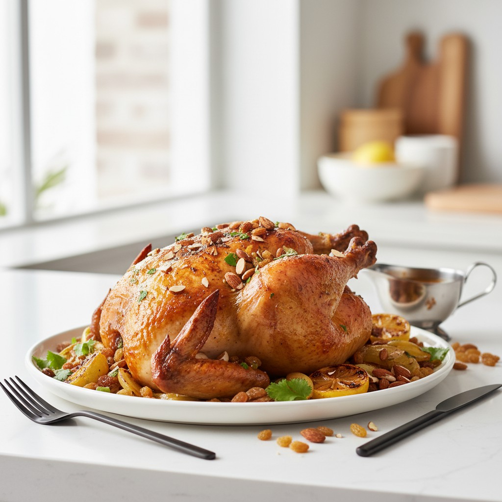 Ce rôti de poulet aux amandes et raisins secs marie la tendreté de la volaille à la douceur fruitée des raisins et au croquant des amandes. Inspirée des traditions méditerranéennes et nord-africaines, cette recette offre un équilibre subtil entre saveurs sucrées et salées, tout en restant accessible et saine. Elle met en valeur la simplicité d’un bon poulet rôti, enrichi d’une garniture raffinée, sans complexité technique inutile. Idéale pour un repas convivial, elle permet de varier du classique rôti dominical tout en conservant une préparation maîtrisable à la maison.