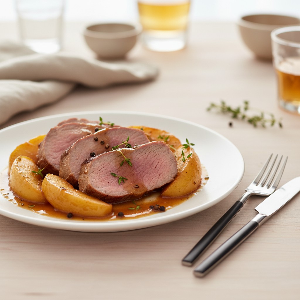- Découpez le rôti en tranches épaisses. Disposez-les sur un plat chaud, entourez des quartiers de pommes dorées et nappez de sauce au cidre. Servez aussitôt, accompagné de légumes de saison ou d’une purée maison.