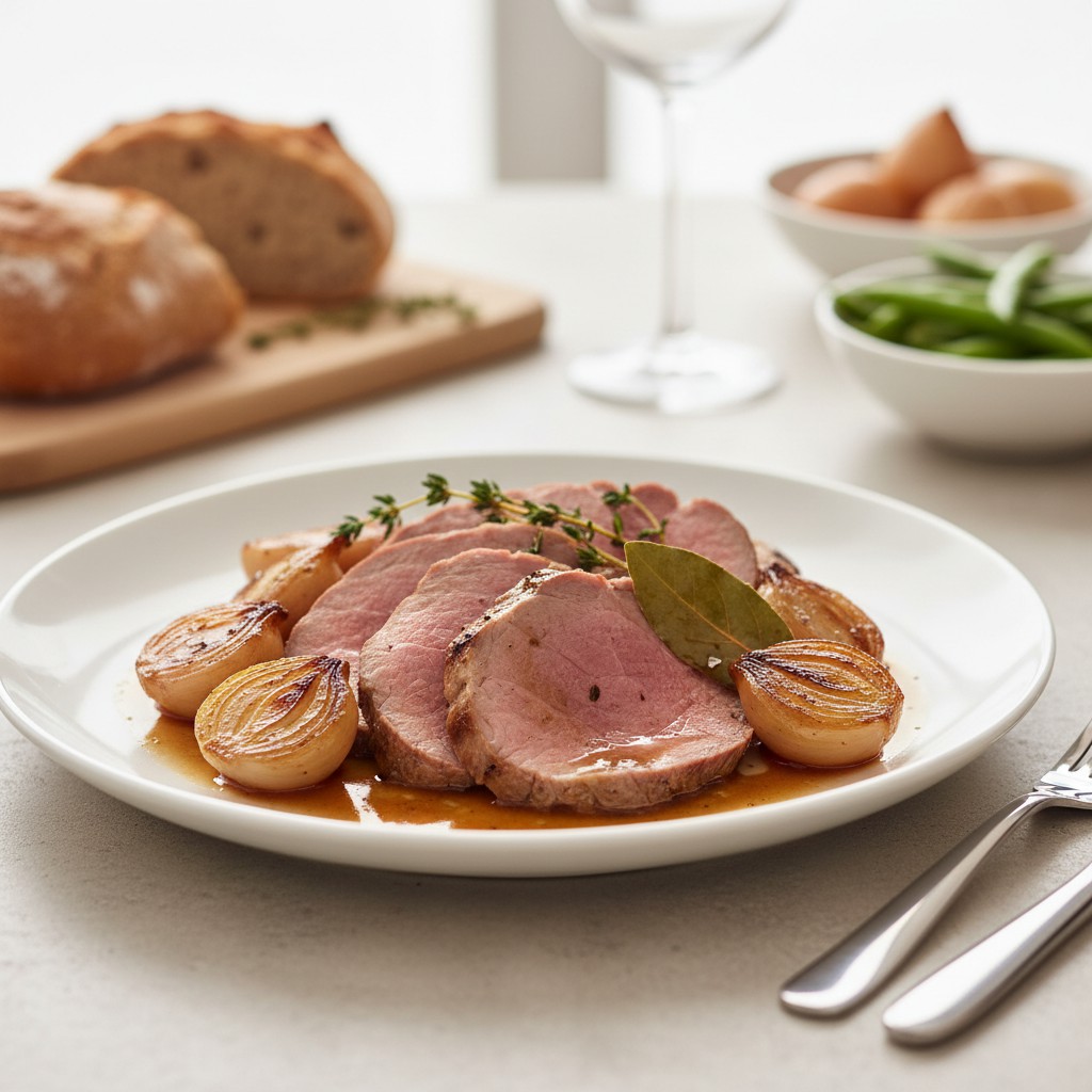 - Découpez le rôti en tranches épaisses, servez avec les échalotes confites et nappez de sauce. Accompagnez de légumes de saison rôtis ou d’une purée maison pour un plat équilibré.