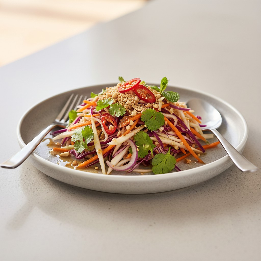 La salade de chou thaï, ou “Yam Pak Ka-na”, est un classique de la cuisine de rue thaïlandaise. Elle séduit par sa fraîcheur, son croquant et l’équilibre subtil entre acidité, douceur, piquant et salinité. Riche en fibres, légère et rassasiante, elle met en valeur le chou blanc ou chinois, accompagné de carottes, d’herbes fraîches et d’une sauce nuoc-mâm citronnée. Cette recette, accessible et rapide, est idéale pour découvrir l’art de l’assaisonnement thaï et apprendre à maîtriser la découpe fine des légumes. Elle s’adapte facilement à différents régimes (végétarien, sans gluten) et constitue une excellente entrée ou un accompagnement pour des plats asiatiques.