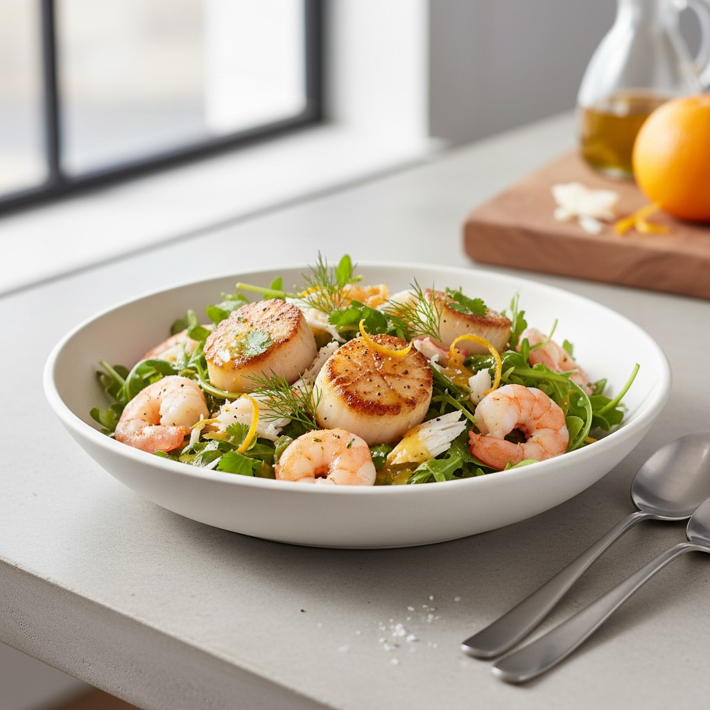 - Dans un grand saladier, mélangez délicatement les crevettes, la chair de crabe et les Saint-Jacques tièdes. Ajoutez la roquette et les herbes fraîches ciselées. Versez la vinaigrette à l’orange et mélangez juste avant de servir pour préserver la texture des crustacés.